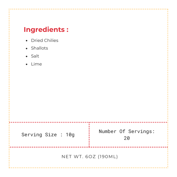 Discover the fiery delight of our Chilli Sambol—an authentic Sri Lankan condiment crafted from an age-old grandmom's recipe. Plain, simple, and perfect in taste, it complements any dish with its bold flavors. Whether paired with dosas, paranthas, savory pancakes, rice, or tossed with pasta, this hot condiment adds a delightful kick to elevate your culinary experience.