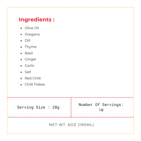 The name "fresh herb marinade" says it all: the goodness of fresh herbs combined with olive oil works perfectly with seafood, tofu, paneer, etc.
