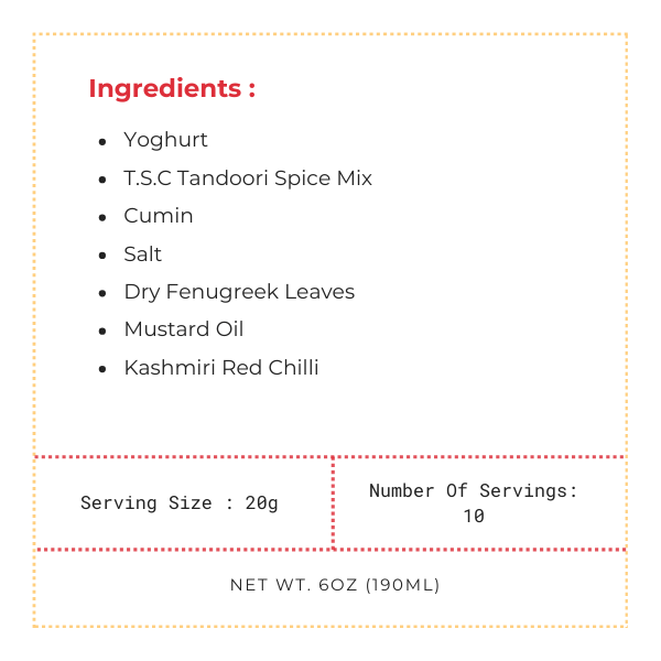 Indulge in our best-selling Tandoori Marinade—an infusion of pure love for those authentic tandoori flavours. Transform mushrooms, chicken, paneer, soya chaps, or any favourite into a tandoori delight in minutes. No spice-hunting or proportion worries! Just mix 2 tablespoons of TSC Tandoori Marinade with 100gms of your chosen protein or veggies, add a tablespoon of butter for extra taste and moistness, then grill or air fry to perfection. Sprinkle with TSC Nani’s Mix for an extra burst of flavour. Tandoori made easy and delicious in a jiffy!